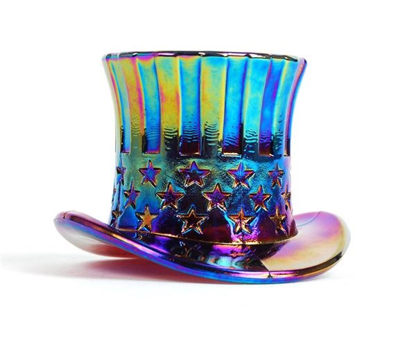 Opalescent New York Yankees carnival glass top hat. Under the brim of this unique 3" commemorative piece is an engraved inscription that reads, "Joe DiMaggio 1955 Baseball Hall of Fame".