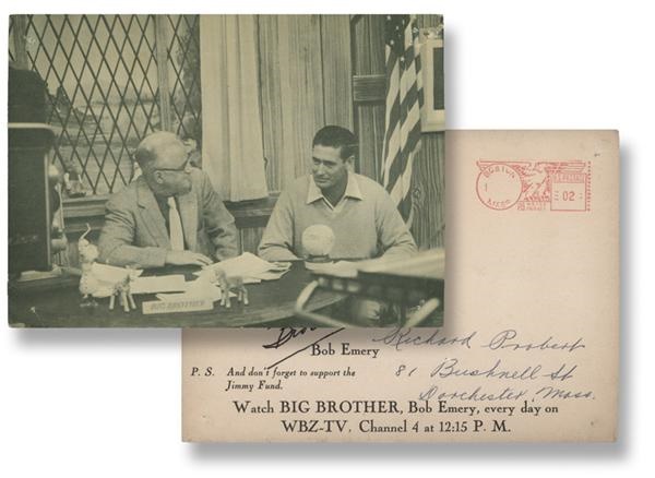 Wonderful and rare WBZ Boston promotional postcard sent out to Boston area kids in 1956. The photo on front is of broadcaster "Big Brother" Bob Emery with Ted Williams. Emery urges kids to head out to Fenway to cheer on the Red Sox and when they can't, watch the games on WBZ-TV. Postmarked 1956 with a WBZ+WBZA 35th anniversary stamp. Postcard has tack holes in the corners and has very slight edge-wear: otherwise, it looks great in VG condition. 5.5 x 7.5"