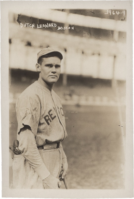 Classic image of talented pitcher Dutch Leonard as a Red Sox by Bain. The image is stamped on the verso by Culver Service and includes a caption about the Cobb/Speaker gambling scandal that stemmed from allegations by Leonard. The 1926 silver gelatin photo measures 4x6" and is NRMT+.