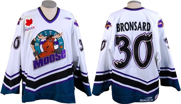 All original white jersey has name sewn on a plate on the back. Number 30 on the back and both sleeves. Molson patch on the left breast and Moose patches on both shoulders. Bauer size 58G tagging in the collar. Moderate use with some minor blood stains, stick marks, paint tranfers and pilling inside.