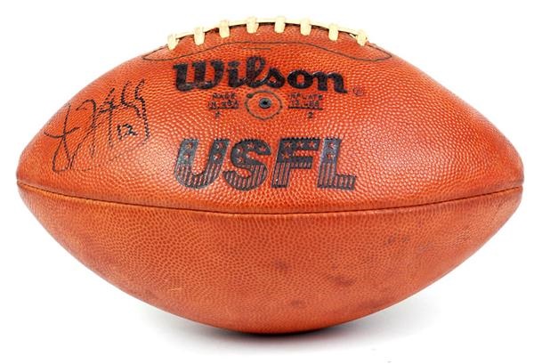 Official Wilson USFL Simmons Game Used Ball signed in black sharpie by Jim Kelly. Ball shows moderate to heavy use, signature is "8/9' on scale of "1-10".