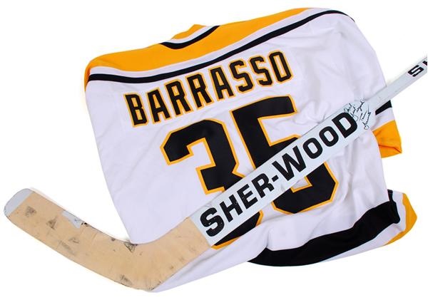 Lot # 472: 1994-95 Tom Barrasso Pittsburgh Penguins Game Issued Jersey and Game Used & Signed Stick