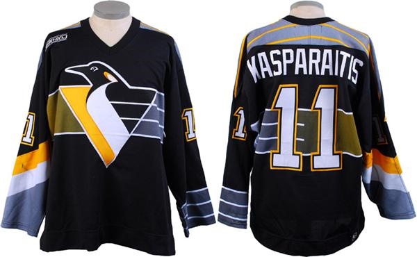 All original black jersey has name sewn on a plate on the back. Number 11 on both sleeves and the back while the NHL 2000 patch is on the right breast. Pro Player size 52 tag in the collar is partially detached. Jersey was also used in the pre season of the next year (2000-01). This is evident by the swatch of material covering the Pro Player logo on the back hem. Moderate use with stick marks and burns.