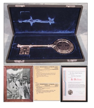 Sure to excite fans of vintage television, this varied assortment of pieces derive from the estate of the small screen's biggest star. 1) Vintage photo of Sullivan at CBS Studios (12.5x16" framed). 2) 1967 certificate naming Sullivan as recipient of "The Actors' Fund Medal." 12x16" framed. 3) Key to the City of Rye, NY. Inscription reads, "To Ed Sullivan, A Favorite Son from Anthony J. Posillipo, Supervisor Town of Rye, 11-16-65." Enormous and weighty key (10" long) is in original velvet-lined case. 4) Western Union telegrams (3) from Governor Cargo of New Mexico, Governor Chafee of Rhode Island and Governor Ronald Reagan of California. LOA's for all pieces.
