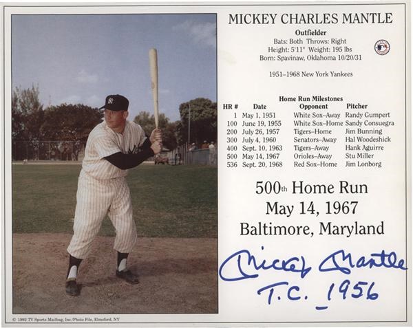 This is a great collection of Stat photo cards of the 500 club players. The cards are all signed in mint blue sharpie and feature such greats as Hank Aaron, Ernie Banks, Jimmy Fox (unsigned), Reggie Jackson, Harmon Killebrew, Mickey Mantle, Eddie Mathews, Willie Mays, Willie McCovey, Melvin Ott (unsigned), Frank Robinson, Babe Ruth (unsigned), Mike Schmidt, Ted Williams, Steve Carlton, Phil Niekro, Gaylord Perry, Nolan Ryan, Tom Seaver, Warren Spahn, Don Sutton, and Early Wynn.