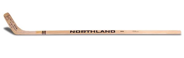This Northland pro, game issue hockey stick, with Howe's name stamped on the top of the shaft, signed on the blade by the great Gordie Howe. He has added extensive inscriptions include; "#9", "Mr. Hockey", "HOF-72", M.V.P. 51 52-55-60-63", "Goals-1071", "Cup-4 x". All are mint in black Sharpie.