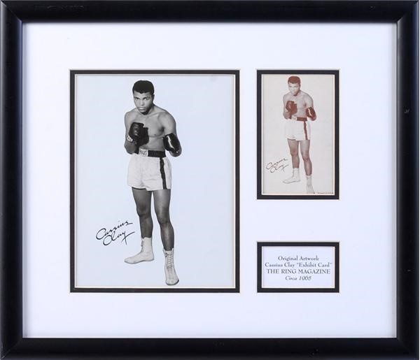 Nicely presented and framed original artwork used to create the Cassius Clay Exhibit Card. Framed display measures 18 1/2" x 16" and contains the original art, a display card, and a plaque stating "Original Artwork, Cassius Clay Exhibit Card, The Ring Magazine, Circa. 1965. A significant lot!