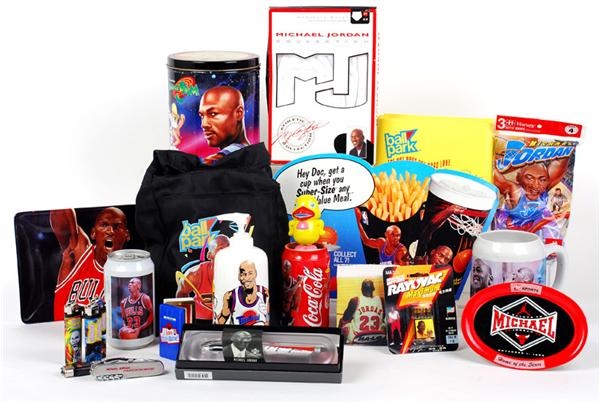 Collectibles (30+) related to Michael Jordan, and his marketing endeavors, including his restaurant, Hanes and Ball Park Franks. Includes mugs, plastic cups, lunch box, cooler packs, matches, lighters, upper deck pens, plates, water bottles, soda cans and other items.