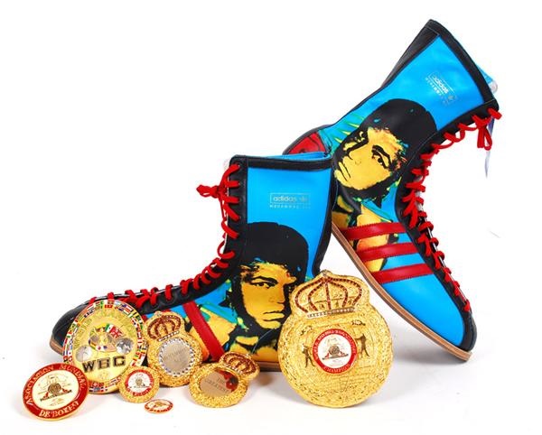 This collection of Ali memorabilia includes a a WBC World Champion Belt Buckle made of bronze, and decoratively painted with flags from around the globe encircling the central image of a boxer standing at the ready. The 6 plates are actually faux gold and enamel medallions from the world boxing association. The brand new adidas boxing boots are turquoise blue with red stripping and laces and the sides of the boots have an image of the great boxer embossed on them. The entire colection is in EX condition.