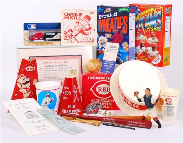 Huge collection of baseball memorabilia (60+) with lots of items related to the Cincinnati Reds. Includes several Wheaties boxes including ones with Jackie Robinson, Michael Jordan and the 1990 Cincinnati Reds. Greatest Team Series limited edition (72/1008) 1:80 scale Cincinnati Reds Tractor Trailer, 1975 Reds World Champions Pocketknife, H&B 1973 and 1976 World Series mini bats, Charlie Hustle Pete Rose 33 and 45rpm records, 1953 Crosley Field All-Star Game messenger pass, and Cincinnati Red Legs cuff links. There is also a Joe DiMaggio St. Patrick's Cathedral Memorial Prayer Service booklet dated April 23, 1999.