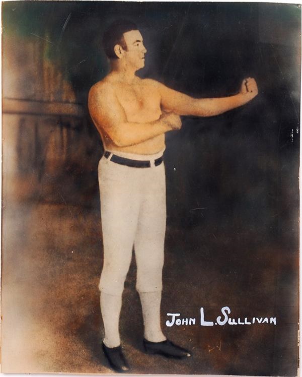 This is a beautifully colorized photograph of the pugilist John L. Sullivan. The image is 15 x 19" and is a prime example of the technique often used at the time to enhance otherwise colorless images. The condition of the photograph is VG due to some fading of the image along the right side.