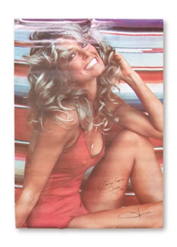 One of the most famous personality posters ever created is authentically signed. Original 1976 "Pro-Arts" poster was recently signed by her in Mint black marker, "Love and Happiness Farrah" (with a drawn heart). Signed for Charlie Sheen, who shares some management people with Ms. Fawcett. 30x20" with the famous nipple.