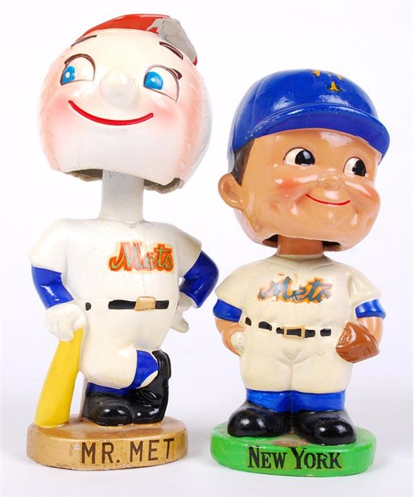 Includes gold base with mascot head and green base with childs head. The mascot head doll has some moderate to heavy chipping on the base of the neck and cap, but the rest of the doll is relatively clean. The green base doll has only some minor chipping on the "Mets" decal on the chest and hat, otherwise very clean. Gold base is VG, Green base is EX-MT.