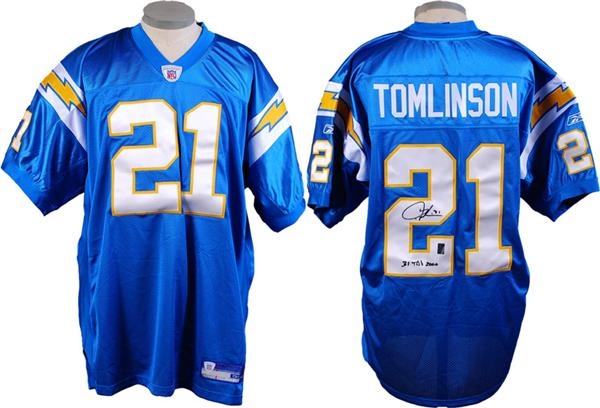 In 2006 Ladainian Tomlinson scored a league leading 186 points. This is a signed San Diego Chargers NFL Equipment Reebok size 54. Tomlinson has signed the verso of the Jersey in black sharpie and has noted "31 TD's 2006". Comes with COA from GTSM.