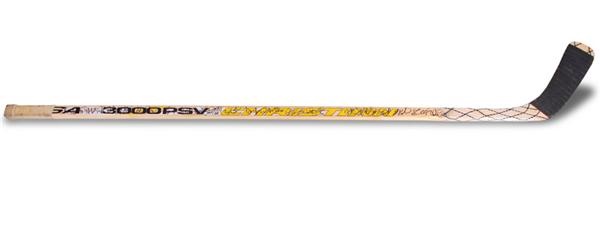 This 61" Christian 3000 PSV hockey stick has been signed by (20) members of the 1993-94 Boston Bruins. Including: Ray Bourque, Jamie Huscroft, Bryan Smolinski, Don Sweeny, Glen Featherstone, Steve Heinze, David Reid, Steve Leach and others. Signatures rate 6-8/10 in black sharpie and stick has original tape on handle and blade.