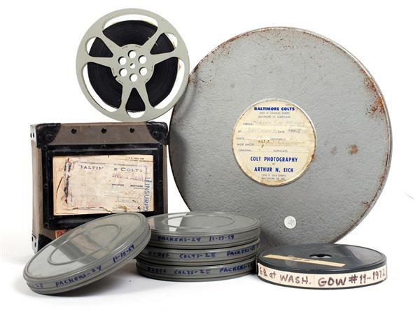 A fascinating piece of NFL and Packer history! Offered here is official NFL game film taken of the Packers between 1959 and 1972. Includes (4) 7", 10mm reels from the Packers defeat at the hands of the Colts on 11-15-59 , (1) 14", 10mm reel of the Packers at the Colts on 10-18-64 in wide angle "Grid Scope" and (1) 7", 10mm reel the Packers at Washington in 1972.