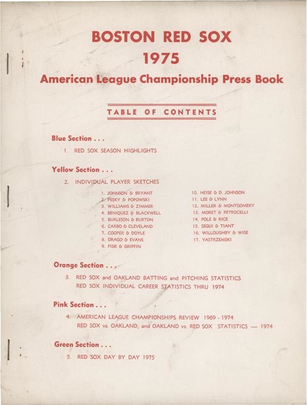 Attention Red Sox fans out there, this is a rare and exciting lot. This 1975 Press Book contains all the season's highlights, individual player sketches, Red Sox and Oakland Batting and Pitching Statistics, Red Sox Individual Career Statistics thru 1974, American League Championships Review from 1969-1974, Red Sox vs. Oakland and Oakland vs. Red Sox statistics - 1974 and the Red Sox day by day, 1975. Hours of entertaining Red Sox history are to be found in this book.