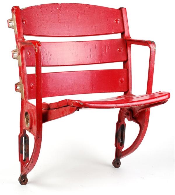 Seat from the classic Cincy baseball park is in red with extra wide with curved back slats, ideal for those of us who like to eat a lot of hot dogs. Red non-figural floor mount and wood slats are in VG-EX with very light rust and paint chips.