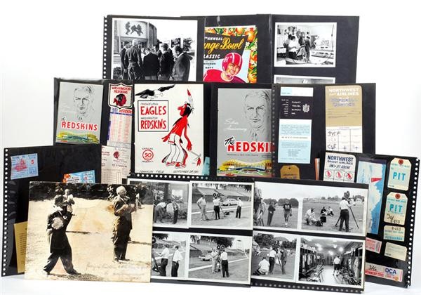 (60) Large scrapbook pages filled with the sports and political mementos collected by photographer Nate Fine. The Senators and Redskins photographer collected the programs, photographer passes, game tickets airline tickets, letters, photos etc. His White House news photographer press card and AAA membership card are even in here. Standouts include an (2) 8x10" photos of a ceremony at the Pro Football Hall of Fame, 5x7 images of Fine at a Navy football game and at work on football sidelines and a 10.5 x 13.5" photo of Fine photographing Harry Truman (also holding a camera) and inscribed by Truman, "Giving instructions to Nate Fine, an expert. By Harry Truman: an inexpert!" (Photo was behind glass which has since broken. Parts of the photo are stuck to pieces of the glass. Inscription is unaffected, but the surface has some paper loss.) Such a wide variety of sports and political ephemera here, it is impossible to cover everything. It is an extremely fascinating collection!