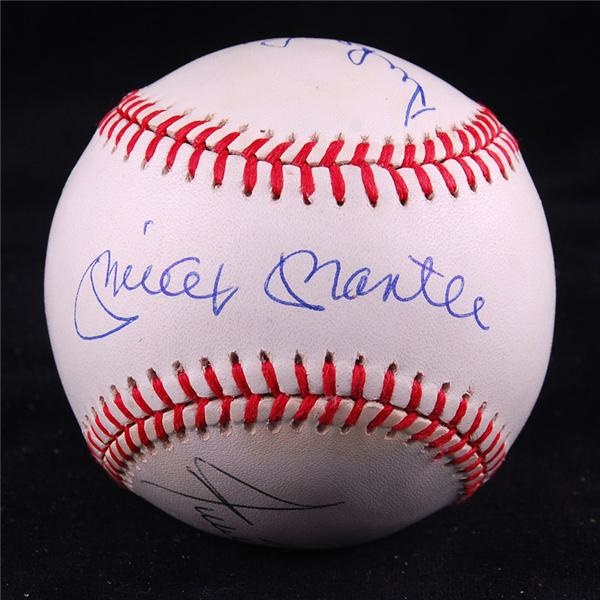 Three of the big New York baseball stars of the 1950's come together here to mint their scribes on this Rawlings ONL (White) ball. Mantle on the SS, the Dodger's Snider on the side, and Giant's Mays on the other side. Sigs are mint.