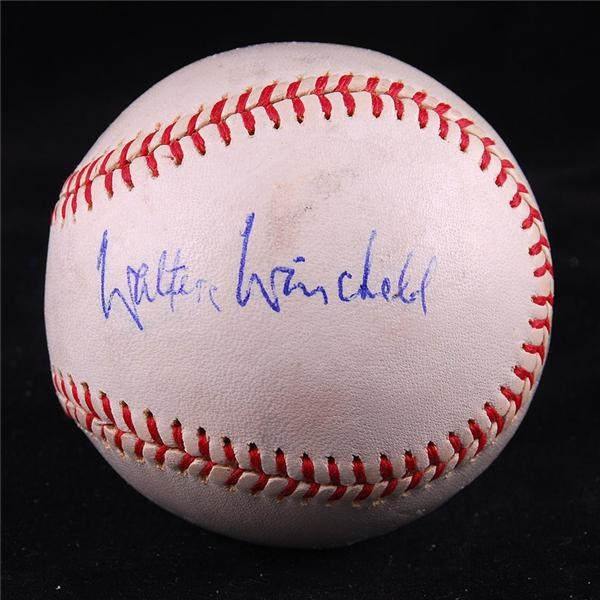 Official American League (Cronin) baseball signed by the man who created, for better or for worse, the newspaper gossip column: Walter Winchell. The signature (rating 7/10) is in blue pall point on a side panel of an off-white ball with some very light spotting.