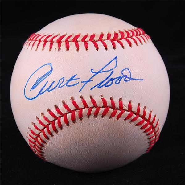 Official National League (White) baseball signed on the sweet spot by defensive standout, Curt Flood. Signature rates 8/10 in blue ball point on an off-white ball.