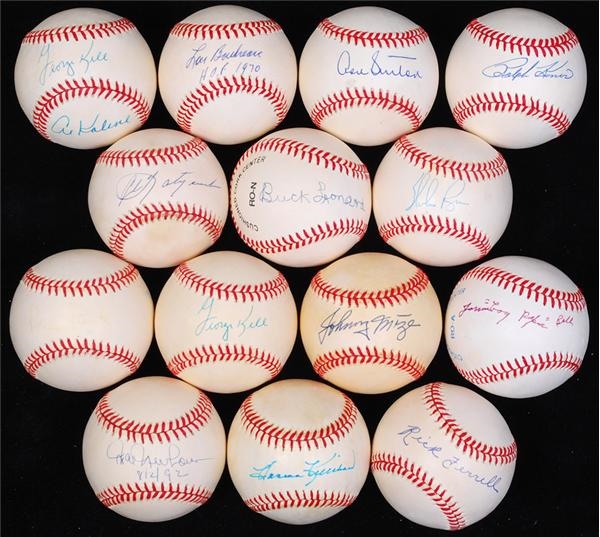 Nice grouping of HOFer single and multi-signed ONL (White) and OAL (Brown) baseballs (14) including the following signatories: Single Signed: George Kell, Rick Ferrell, Robin Roberts (very faded 1-2/10), Lou Boudreau, Harmon Killebrew, Ralph Kiner, Nolan Ryan, Yaz, Don Sutton, Buck Leonard, Cool Papa Bell, Johnny Mize and Hal Newhouser. There is one multi signed by Kell and Kaline. Balls all range in condition from EX thru NRMT and signatures average 8-9/10.