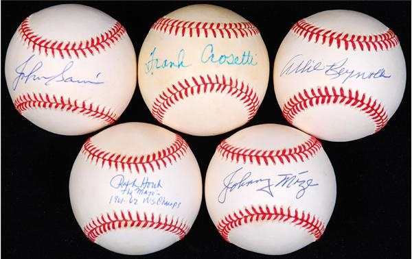 This is an amazing collection of Yankees single signed baseball’s, signed by players from the teams’ heydays in the 1940’s-1960’s and are from some of the era’s most beloved Yankee stars. There is an Official American League Bobby Brown ball signed on the sweet spot in blue marker by Frank Crosetti. This ball has some minor toning but the bold and clear signature rate as an 8.5/10. There is an official American League Bobby Brown ball signed on the sweet spot in blue ball point ink by Ralph Houk with 1961-62 W.S. Champs written under his name. The ball as some spots of toning but the signature is clear and vibrant and rates a 9/10. There is an official National League Coleman ball signed on the sweet spot in blue ball point by John Sain. The ball is bright white and has a Jackie Robinson 50th Anniversary stamping on it, the signature rates an 8.5/10. There is also another Bobby Brown ball signed on the sweet spot in blue ball point by Allie Reynolds. The ball is a nice white color and the signature is clear and rates a 9/10. Lastly is another official Brown ball signed on the sweet spot by Johnny Mize. This is yet another vibrant white ball with a bold, clear signature that rates a 9/10.