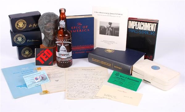 Hours of fun rummaging through our political history are to be found in this richly diverse collection of political memorabila which runs the gamut. There are more than 25 pieces of correspondence, some letters, many invitations to historic events as the Inauguration of President Reagen, the funeral program for Tip O'Neil, sheet music from the funeral of our martyred president William McKinley. There are also 3 books included, a copy of Impeachment by Irving Brant, The Epic of America by James Truslow Adams, and the bound report of The President's Commission on The Assaination of President Kennedy. There are various golf balls obviously given out as gifts with Presidential and Vice-Presidental seals, there is even a Lady Shick razor given to Dorothy Lamour by President Nixon in a box embossed with the presidential seal. Also, there is gavel of Chairman Henry J. Hyde from the Articles of Impeachment dated December 11 and 12, 1998. As I said hours of entertainment are to be had digging through this treasure trove.