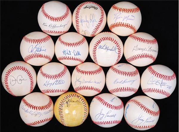 Large grouping of baseballs (45) signed by many of the games greats including back to back no-hitter hurler Johnny Vander Meer, Red Sox great Mel Parnell, 2 time AL batting champion Mickey Vernon, Negro Leaguers Bobby Robinson, known as the Human Vacuum Cleaner, Ernest Burke of the Baltimore Elite Giants, Verdell Lefty Mathis and Lyman Bostock Sr. 1994 Cy Young winner David Cone, 2 time NL shutout leader Ken Raffensberger, Clyde Sukeforth who scouted and signed Jackie Robinson, Boston Braves 1945 HR king Tommy Holmes, NL record holder for games finished (574) Elroy Face, team signed minor league ball with Tommy Lasorda on the SS, Yankee relief pitcher Sparky Lyle, Yankee, Dodger and Brave Buddy Hassett, Yankee Allie Clark, and Albert Bell among many others.