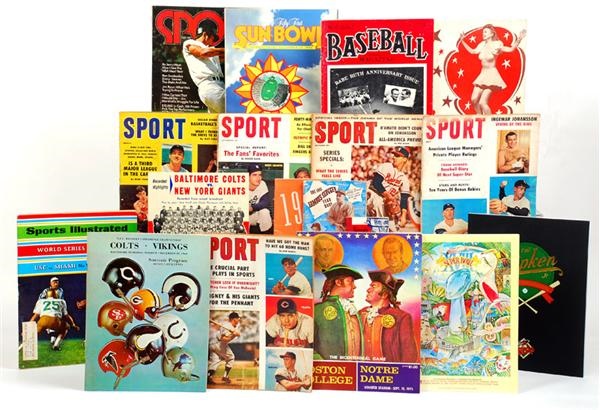 This is an enormous and amazing collection of various sports publications, mostly magazines, a few books, and several game programs. There are even some photographs, several comic books and even some play by play log sheets primarily from the Washington Redskins. There is a copy of the TV/Radio Broadcast of the 1958 Colts vs. Giants game that is regarded as the greatest game ever played. There are several issues of the Famous Slugger Yearbook, and of course several issues of Sports Illustrated, including the first issue to cover the world series in color. There are some early issues of Sport Magazine and some 1930's issues of Time magazine. I kid you not when I say you'll have days if not weeks woth of reading perusing through this incredible collection of sports literature.