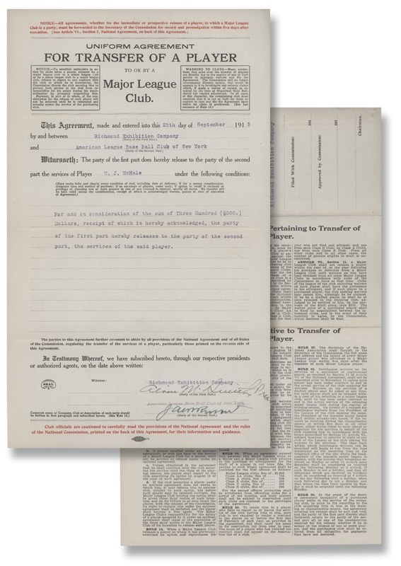 This official transfer agreement shows Marty McHale being transferred from the Yankees to Richmond, VA. This is considered a Ruppert "Rookie" signature since it dates from the first year that he owned the team. The document is in EX condition with the expected fold lines, but otherwise devoid of wrinkles or tears and good color quality for document of it's age.