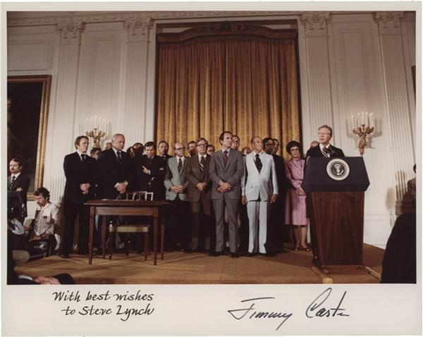 This 8 x 10" photograph of Jimmy carter standing at a podium with various staff members behind him is dated 1980. The photograph is dedicated "With best wishes to Steve Lynch" a staff member and is signed in black felt tip pen by the 39th President of the United States at the very end of his presidency. The stamping on the back states that it is an Official White House photograph. The image and signature is in EX condition