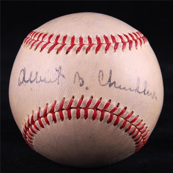 "Happy" Chandler was an incredible figure in sport's history in that not only did he play the game, he was the 2nd Commisioner of MLB, a U.S. Senator and twice served as the Governor of Kentucky. This vintage Spalding Official National League Ford Frick ball is signed on the sweet spot by Albert B. Chandler. The ball has some toning concurrent with the age of the ball and the black ink signature rates an 8/10.