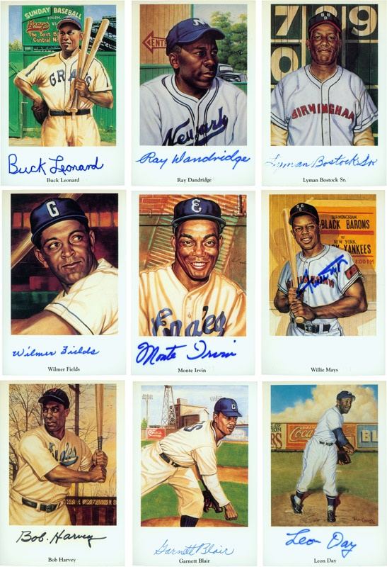 A wonderful, near complete (29 of 30, missing #16) set of signed Ron Lewis Negro League baseball postcards. Players who have autographed their cards include: 1. George Giles 2. Bill (Ready) Cash 3. Bo Harney 4. Lyman Bostock Sr. 5. Ray Dandridge 6. Leon Day 7. Verdell Lefty Mathis 8. Col. Jimmie Crutchfield 9. Clyde Mc Neal 10. Bill Wright 11. Mahlon Duckett 12. William Bobby Robinson 13. Max Manning 14. Armando Vazquez 15. Jehosie Heard 17. Wilmer Fields 18. Lonnie Blair 19. Garnett Blair 20. Monte Irvin 21. Willie Mays 22. Buck Leonard 23. Frank Evans 24. Josh Gibson Jr. 25. Ted Double Duty Radcliff 26. Josh Johnson 27. Gene Benson 28. Lester Lockett 29. Cowan "Bubba" Hyde 30. Rufus Lewis. Average signature rates 8/10 in a group that ranges from 7-10/10.