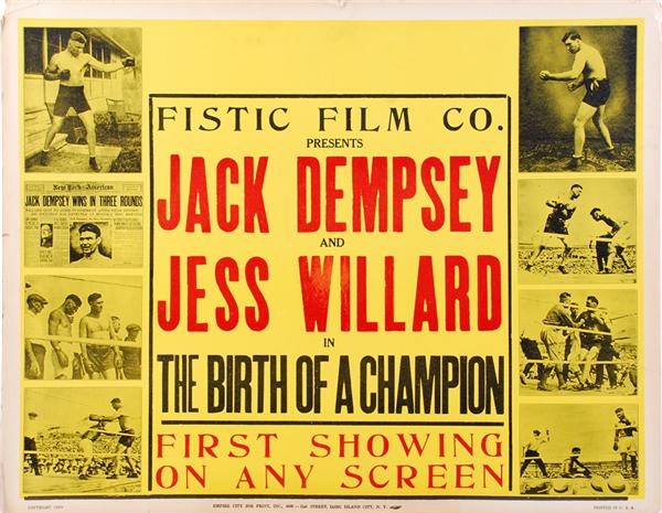 This promotional poster from the Fistic Film co. is advertising the film Jack Dempsey and Jess Willard in The Birth of a Champion. The 22x28 poster, copyrighted in 1939, is a vibrant yellow with red and black lettering that shows very little fading or aging. There are some minor ?” tears and wrinkling around the white border, but they do not detract from the EX quality of the poster overall.