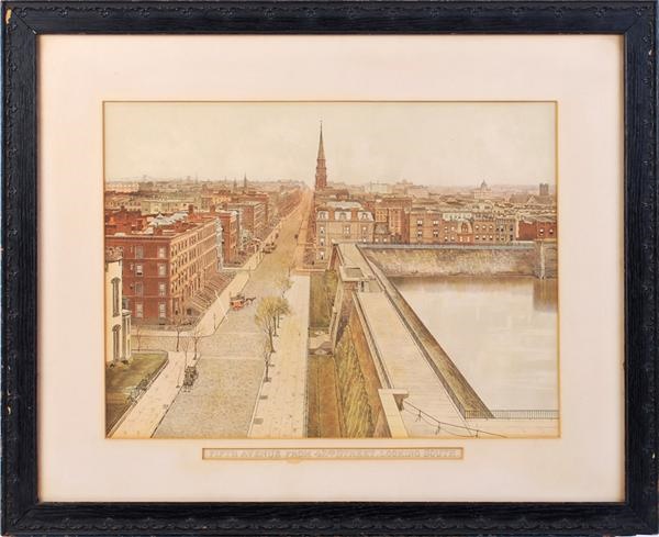 This beautifully colored print captures a unique view of late 19th Century Manhattan. The view is looking south down 5th Avenue and on the right side of the image, where today you'd be seeing the iconic image of the 2 lions gracing the front of the New York Public Library, you see the wall around the reservoir, made famous by Caleb Carr in the historic novel The Alienist, that was the city's water supply at the time. It is truly a unique perspective that captures a moment in a city that is constantly changin. The quality of the print is EX with no wrinkling or tearing and good color quality.
