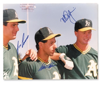 Oakland had some power in their young bats back then, with two of the three pictured filling the headlines with their home run power for years. Blue sharpie signatures from each are NRMT, as is the photo itself.