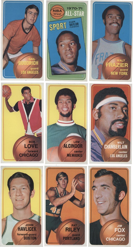 Key Cards grade #50 Wilt Chamberlain EX-MT, #7 Bill Bradley EX-MT, #75 Lew Alcindor EX-MT, #123 Pete Maravich EX-MT. The rest of the set grades comparatively with 85% ranging from EX to NRMT and the remaining 15% of lesser quality.