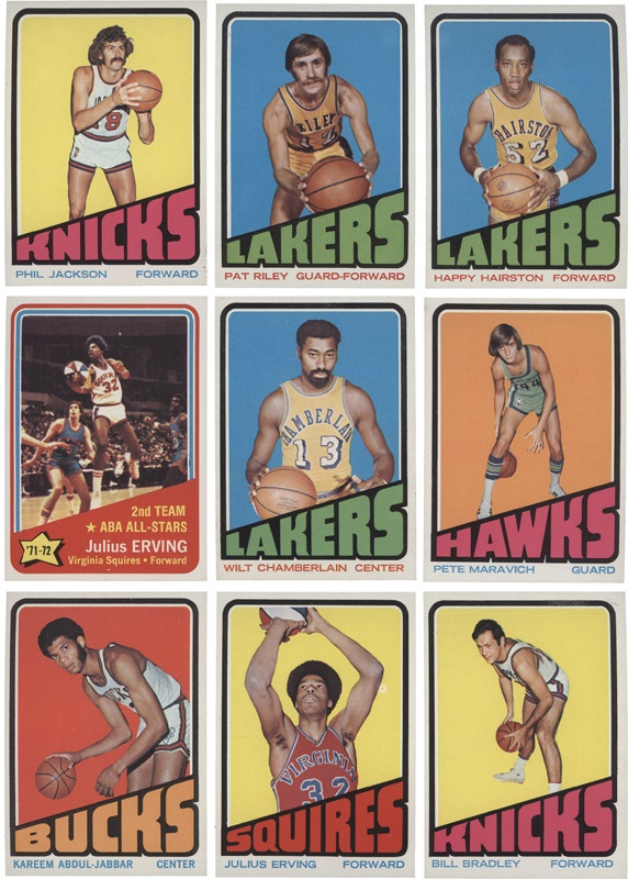 This is an outstanding complete collection of the 1972-1973 NBA Topps cards. Key Cards grade #32 Phil Jackson EX-MT, #122 Bill Bradley EX-MT, #100 Kareem Abdul-Jabar EX-MT, #5 Pete Maravich EX-MT, #1 Wilt Chamberlain EX-MT, #255 Juilus Irving NRMT and #195 Julius Irving EX-MT. The grading on the reast of the collection is consistent with the key cards. A fantastic collection, and the great part is that as a complete set, all the hard work of collecting the cards is done