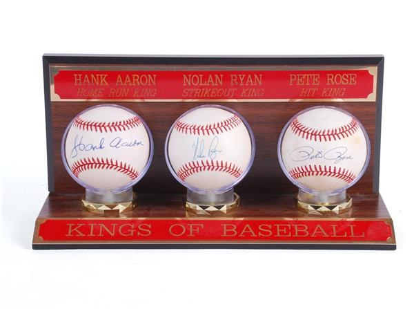A display entitled "King's of Baseball" contains (3) balls single signed by true baseball royalty. "The Hit King" is an ONL (Coleman) ball signed in the sweet spot in MT blue ball point by Hank Aaron on a white ball. "The Strikeout King" is an OAL (Brown) ball signed on the sweet spot in MT blue ball point by Nolan Ryan. (Ball is white with some very light handling marks.) "The Hit King" is an ONL (White) ball signed on the sweet spot in MT blue ball point by Pete Rose. Handling marks are visible on panels.)