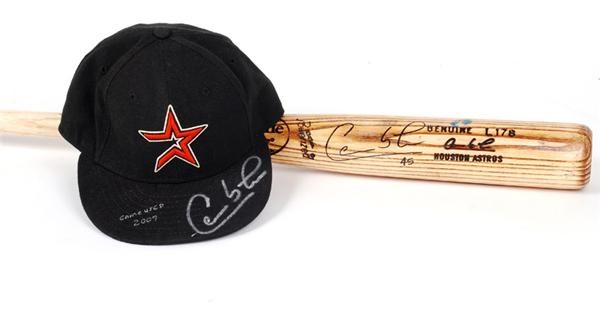 The 34”, 125 Louisville Slugger Genuine L178 cupped top Houston Astros bat is game used and signed by Carlos Lee on the shaft in Black Sharpie. There are definite ball marks on the bat as well as several rack marks along the shaft. There is also a big bold 45, Lee’s number, written on the knob of the bat. The New Era, authentic collection hat is a size 7 ? and is also game used. Carlos Lee has signed the top of the bill with his autograph and also a game used 2007; on the underside of the brim, The Horse is inscribed in silver ink, his nickname. Both pieces show good game use.