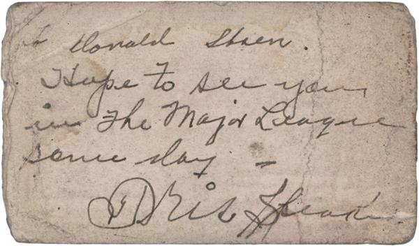 Tristram Speaker is known as one of baseball's greatest offensive and defensive center fielders in history. He was inducted into the Hall of Fame in 1937, only its second year of existence. This business card of Edwin P McCausland is inscribed on the back by Speaker "To Donald Sheen, Hope to see you in the major League someday" with a bold signature right below it. The writing on the standard 2 x 3.5" business card is in black steel-tip fountain pen ink. This card comes with a JSA LOA.
