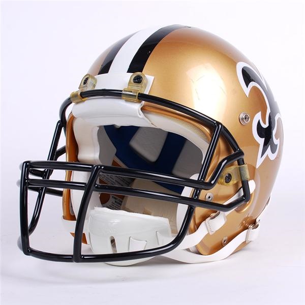This is an authentic game issued New Orleans Saints helmet that dates from the 1980's. The gold helmet has the Saint's logo on each side. The only tagging is on the back of the helmet and most of it is covered with the official NFL logo. The helmet is in mint condition meaning it was most likely never used during a game, but what fun could you have showing up to your Saturday morning flag football game wearing it.