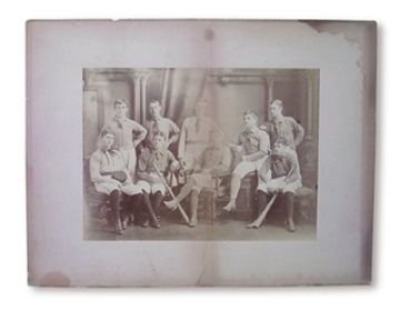 Stunning albumen print mounted on cardboard. Verso is inscribed with the "1st Nine Base Ball Club of St. Mary's 1882-83" with the names of six players: John Corliss (NY), Fat O' Reilly (NY), Mal. Callaghan (Boston), Charles Wingsoter (?), Harry MacKey (Ottawa), Joe Peltier. It has a heavy crease down the center and slight water stain to edge, o/w EX.