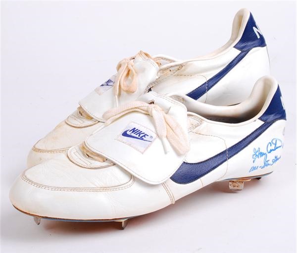 Pair of Nike white and blue cleats worn by Hall of Famer Gary Carter during the a 1980's All-Star Game (he was in several). Carter's authenticated hologram is affixed to each and they are both signed in blue sharpie "Gary Carter #8 All-Star Game." They show really nice use as they were probably worn for more than just one game.