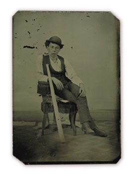 Charming one of a kind image of a cigarette-smoking ballplayer dates from the earliest days of baseball photography. Sure, he's more "Brooklyn Bum" than "Bambino," but no vintage baseball collection is complete without a great tintype like this one.