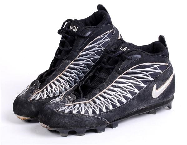 Nike brank cleats used by Barry Larkin. The name "LARKIN" is stitched onto each tongue and Larkin's number "11" is stiched onto the back of each shoe. Both show moderate to heavy use.