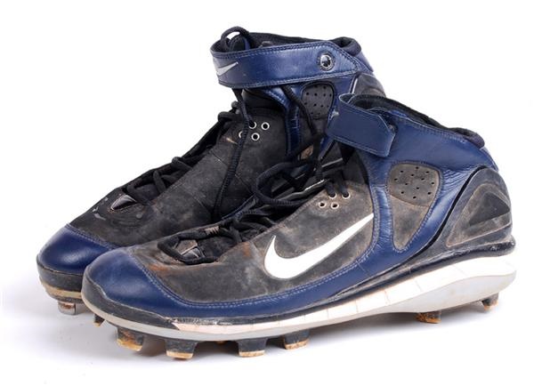 Blue Nike cleats with Cano's number "22" stitched onto the back of each shoe. Each tongue has a "Cano" hologram decal affixed. There is one left and one right shoe, however they are mismatched as one is a turf shoe and the other a spike. Shows heavy use.