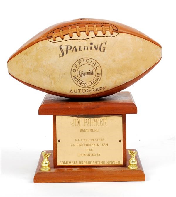 This 1965 All-Pro Football team award was presented by CBS to Jim Parker in 1965. The solid wood base has a gold plaque with the trophy's information on it. There are a few signatures on the ball that sits on the wood base, of course there is Jim Parker, Bob St. Claire, Raymond Berry, Y. A. Tittle, Mike Ditka, Stan Jones, Leo Nomellini and a few others that are severely faded. The trophy and ball come with an LOA signed by Parker himself and dated October of 2002.
